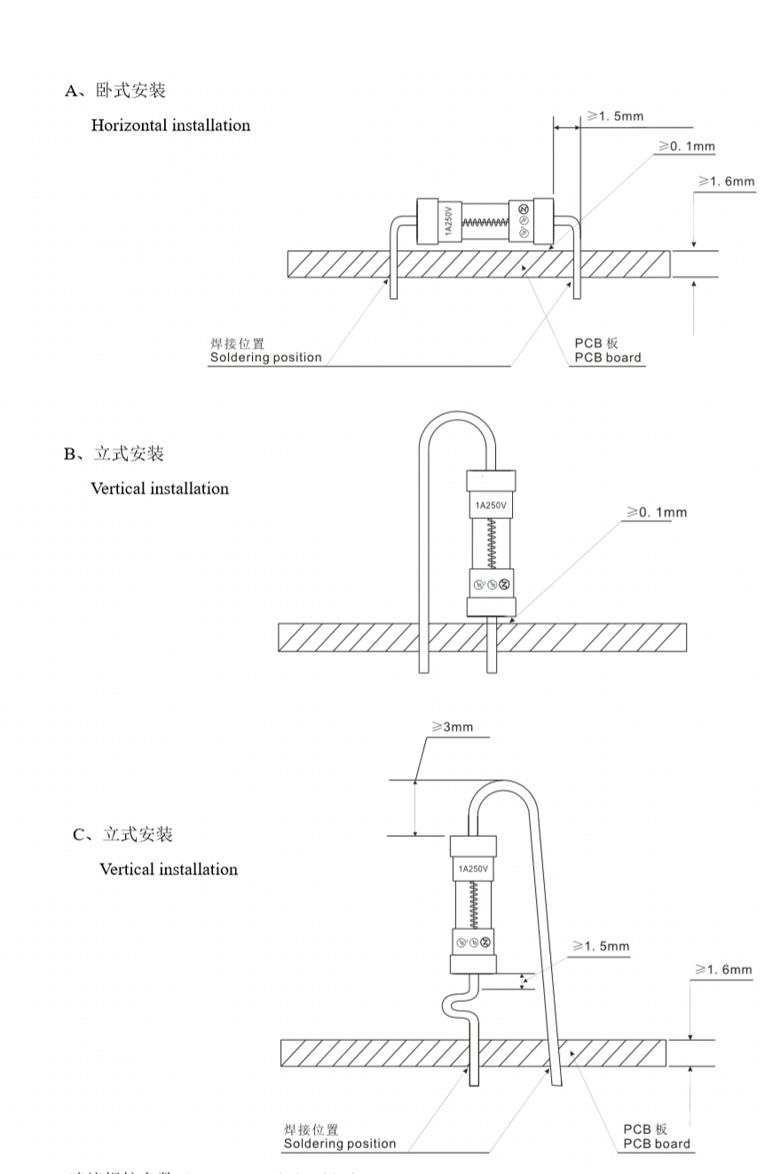 3.6*10的1A玻璃管保險(xiǎn)絲的安裝方式有三種,一種是臥式安裝,另外一種是立式安裝,立式安裝有兩種,詳細(xì)安裝視圖如下圖所示: