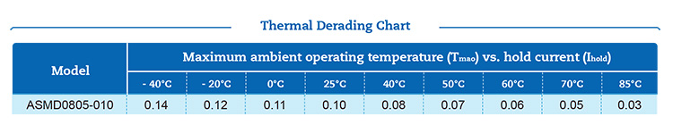 集電通0805封裝貼片自恢復(fù)保險(xiǎn)絲對(duì)應(yīng)系列為ASMD0805系列,該系列提供微型表面貼裝可復(fù)位過(guò)流保護(hù),保持電流范圍為50mA至1.5A。該系列適用于空間有限且器件電流低的超便攜應(yīng)用。集電通0805封裝0.1A 60V貼片自恢復(fù)保險(xiǎn)絲對(duì)應(yīng)型號(hào)為ASMD0805-010-60V,絲印為“1”,保持電流0.1A,最大電壓60V,最大電流40A,動(dòng)作電流0.25A,功耗為0.5W,最小內(nèi)阻為1Ω,上機(jī)一小時(shí)后最大內(nèi)阻為9Ω,正常工作溫度范圍為 -40 °C~+85 °C,工程師在進(jìn)行保險(xiǎn)絲選型時(shí),需要注意板子工作環(huán)境溫度的影響,保險(xiǎn)絲在不同工作環(huán)境溫度下額定電流及動(dòng)作電流都會(huì)有折減,ASMD0805-010-60V工作環(huán)境溫度對(duì)額定電流的影響如下表所示: