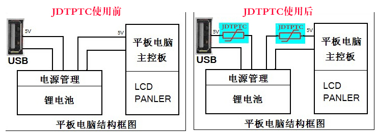 不僅僅是在端口,USB負載短路導致的平板電腦控制電路的燒壞、灌入電流使平板電腦內(nèi)部電路燒壞等等,這些問題主要是控制電路輸出和USB接口的5V電源線上保險絲的問題,因此使用集電通自恢復保險絲(JDTPTC)能很快解決這類問題。如圖所示: